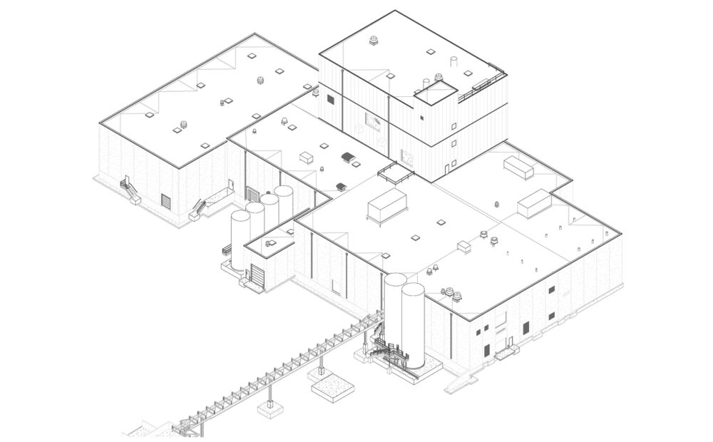 All the architectural and structural drawings were produced in a Revit Building Information Model (BIM). The Revit model included the building mechanical drawings, produced in 3D AutoCAD, and the process piping layout completed by the owner. Interference checking was completed in the model for coordination purposes eliminating costly delays and unnecessary changes during construction.