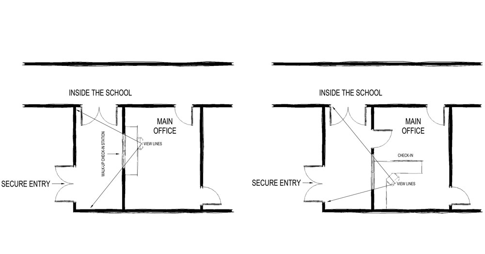 The sketches above show two different examples of secure entries, including door placement and sight lines for school staff to supervise the comings and goings of students, staff and visitors. (CANCO illustrations by Cindy Larson)