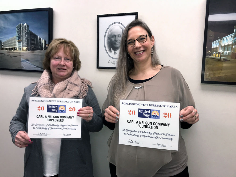 Renita Jarrett, left, payroll manager, and Christine Robertson, vice president of finance at Carl A. Nelson & Company, display certificates received from the Burlington/West Burlington Area United Way recognizing employees' and the Carl A. Nelson Charitable Foundation's support of United Way. (CANCO photo)