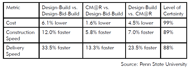 The selection of a project delivery method can have a significant impact on the success of a project and as such has been the subject of multiple research projects with statistically significant results. One of the better studies out of Penn State University looked at 351 projects across a range of project types and locations. A summary of the results is seen in the table below, and correlates to our experience.