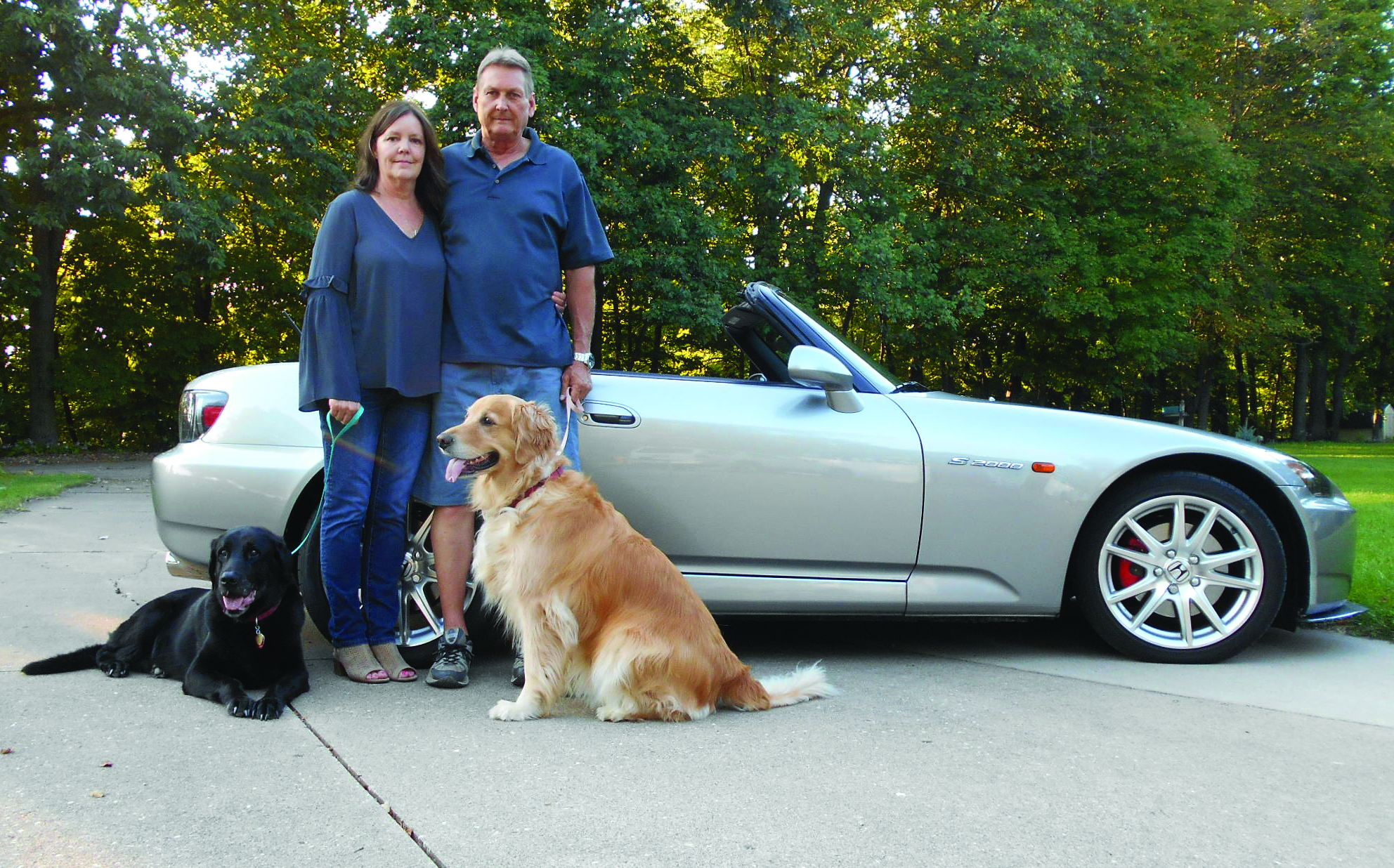LARRY LINDHART, SYSTEMS BUILDING MANAGER AT CARL A. NELSON & COMPANY, AND HIS WIFE, CAROL, POSE FOR A PHOTO WITH THEIR DOGS, JACKSON, THE BLACK LABRADOR RETRIEVER AT LEFT, AND LEXI, THE GOLDEN RETRIEVER AT RIGHT; AND THEIR 2005 HONDA S2000 CONVERTIBLE. (LINDHART FAMILY PHOTO, PROVIDED)