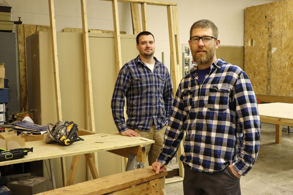 Kyle Krieger, foreground, with building trades team teacher Joey DeHart, a December 2019 graduate of the University of Northern Iowa in industrial technology and engineering education. (CANCO photo)