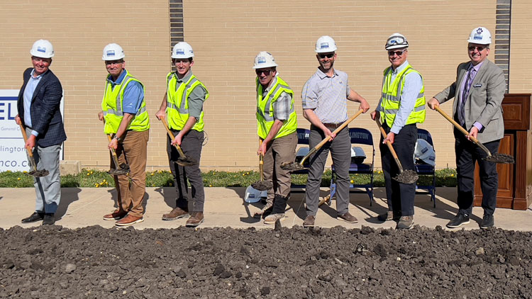 Bray Architects President Matt Wolfert, left, and Burlington Community School District Superintendent Robert Scott, join Carl A. Nelson & Company project and leadership team members for a photo during groundbreaking ceremonies April 12, 2023, at Burlington High School. Representing CANCO are, from second left, Dan Culp, director of business development; Will Porter, project engineer; Mark Hall, project superintendent; Chris Smith, vice president of operations (Burlington); and Tim Seibert, P.E., president and project manager. (CANCO photo)
