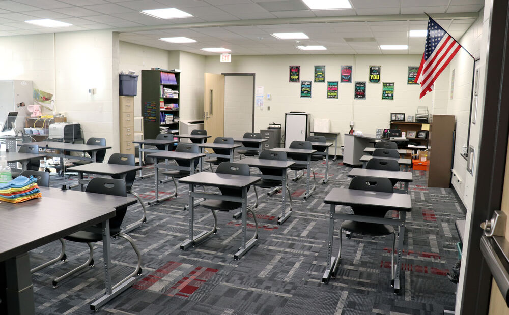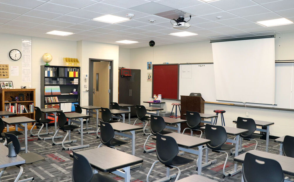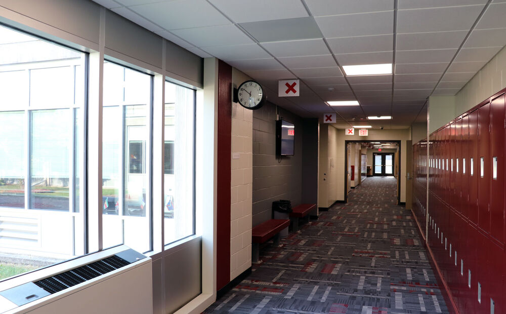 Remodeling included the addition of new flooring, paint, doors and ceilings, upgrades to the Family Consumer Sciences classroom and locker room showers, ADA restrooms, new data cabling and servers, and installation of security features in the main entrance to the school.