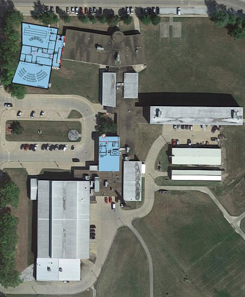 This image shows a Google satellite view of Keokuk High School, overlaid with drawings by SVPA Architects, showing locations of construction that will be underway during spring and summer 2022. In the upper left is the 8,000 square-foot Music Wing Addition. The center of the image shows placement of the 4,000 square feet being renovated as a secure school entrance. CANCO composite