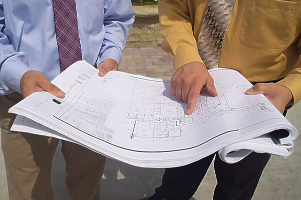 A Carl A. Nelson & Company project manager reviews pre-construction drawings of a hospital project. A builder's perspective at this early phase allows for alterations to be made in the design at a time when the cost to make changes is lowest. CANCO photo