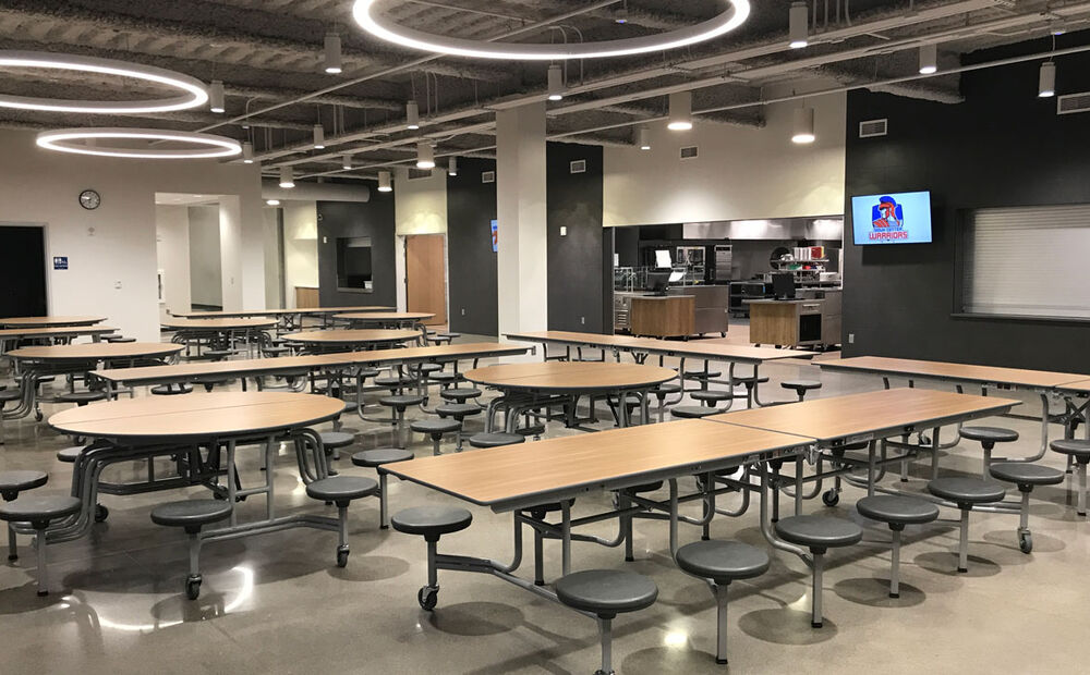 The new, two-story high school includes a sunken gymnasium with space for basketball, volleyball and wrestling, weight training and wellness activities; a main level with classrooms, team rooms, media center, learning stairs, culinary arts, band, choir, art, student services and administration. And a second story with science and lab rooms, PLC area, custodial areas, team rooms and a fashion lab. The career and technical education area includes a robotics lab, digital lab, black box multipurpose theater, ag lab room, maker space lab and woods and welding classrooms.