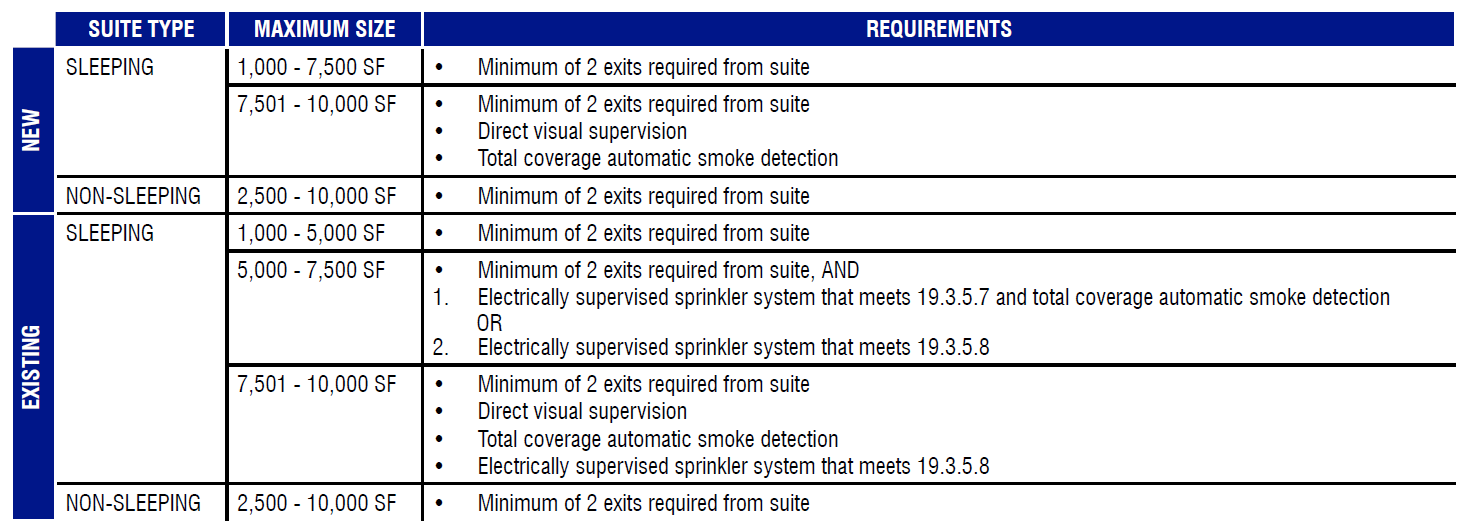 For sleeping suites, requirements vary between existing and new occupancies. In new occupancies, the maximum size limitation is 7,500 SF. If direct supervision and total coverage automatic smoke detection is present, the suite can be up to 10,000 SF. In existing occupancies, the maximum size is 5,000 SF. Options to increase the size up to 7,500 SF include: 1) the smoke compartment the suite is in is protected throughout by an electrically supervised sprinkler system that meets section 19.3.5.7, and has total coverage automatic smoke detection; or 2) the smoke compartment contains an electrically supervised sprinkler system that meets section 19.3.5.8 (quick-response sprinklers). The suite can grow up to 10,000 SF in size if it has direct supervision, total coverage automatic smoke detection, and an electrically supervised sprinkler system that meets section 19.3.5.8 (quick-response sprinklers) throughout the suite.